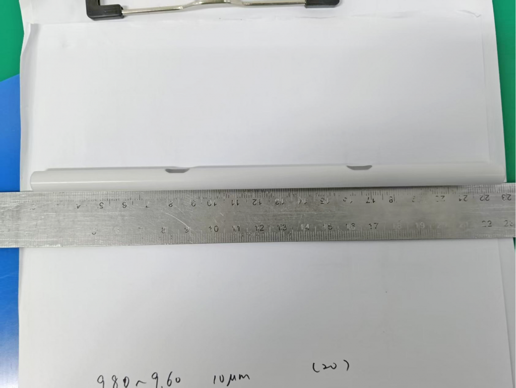 近期有一位新加坡研究院的客户找到了上海鞍提仕团队,他希望用无心磨床加工高精度氧化铝陶瓷棒,他的工件长度是203mm,直径为9.4±0.005mm,直线度2.5微米,圆度0.5微米,表面光洁度(Ra)0.2微米,圆度以及精度要求比较高,并且该陶瓷棒工件还有两个小坡口。