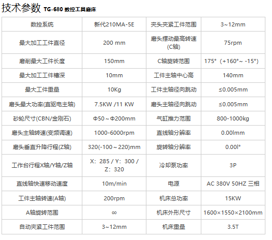 TG-680是一款高精度刀具磨床,专为精密磨削小规格铣刀、钻刀及成形刀具而设计。机床采用天然大理石构件与全封闭结构,配备直驱变频电主轴,支持多砂轮组快速换位,兼顾高刚性与工艺灵活性。工件主轴采用DD直驱并集成W20刀柄与筒夹,实现自动夹持。搭载新代六轴联动系统、安川伺服单元、雷尼绍测头、上银导轨与THK丝杠,确保卓越动态精度与稳定性。操作配置涵盖悬臂式面板、电子手轮、冷却系统及自动润滑功能,兼顾高效生产与便捷维护。